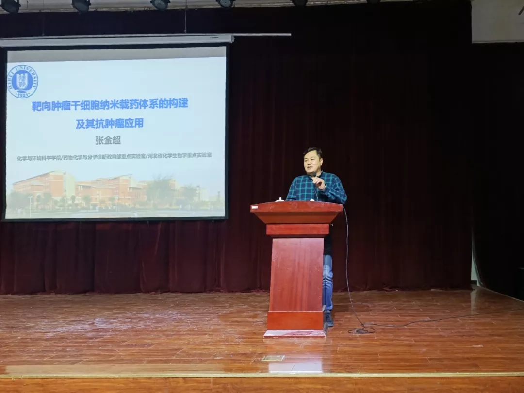2019年12月16日下午3:30,河北大学化学与环境科学公司经理、药物化学与分子诊断教育部重点实验室常务副主任以及河北省化员工物学重点实验室主任张金超教授应yl23411永利官网邀请,在老员工活动中心3号厅作了题为“靶向肿瘤干细胞纳米载药体系的构建机器抗肿瘤应用”的学术报告。报告会由yl23411永利官网副经理张香美主持,本科生、研究生及教师400余人参加。