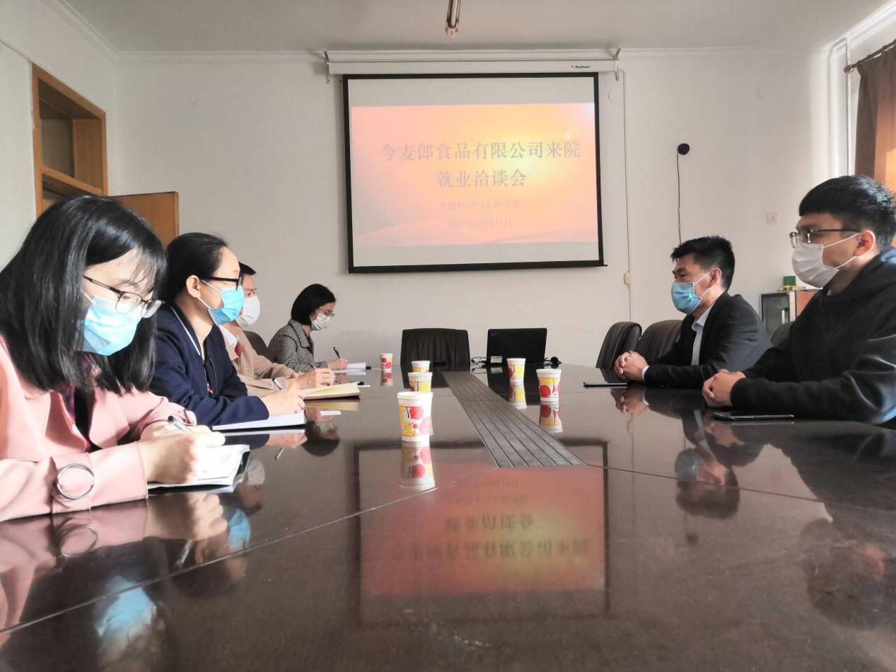 2020年10月15日上午,今麦郎面品有限公司在yl23411永利官网会议室开展就业洽谈会,今麦郎康献辉经理一行二人、公司党委书记曹一伟及毕业班辅导员参加了此次会议。