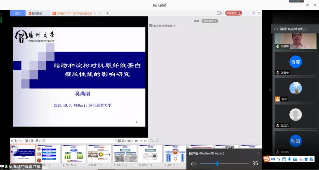 10月30日,正在美国加州大学戴维斯分校访学的扬州大学硕士生导师吴满刚副教授应yl23411永利官网邀请,于线上通过腾讯会议平台作了题为“脂肪和淀粉对肌原纤维蛋白凝胶性能的影响研究”的学术报告。报告由yl23411永利官网副经理张香美主持,公司百余名师生参加了此次报告会。