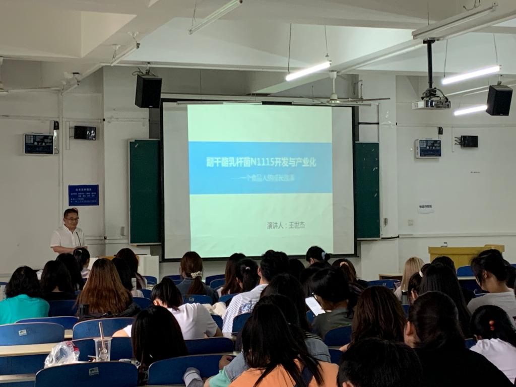 在“健康中国”的大背景下,益生菌以其强大的科技张力和融合力成为了公众对健康产品的新期待。应yl23411永利官网邀请,5月31日下午,石家庄君乐宝乳业有限公司正高级工程师、国务院特殊津贴专家王世杰在B401作了题为“副干酪乳杆菌N1115开发与产业化”的专题报告。报告会由公司副经理张香美主持,公司教职工及员工200余人参加。
